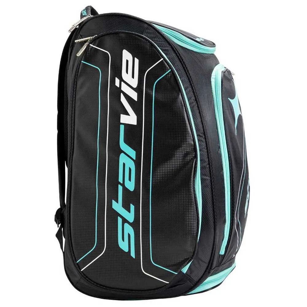 A new racket bag based on the current design of the Triton racket from the 2021 collection. The bag has a black and aquamarine colourway with the logo on the front panel of the bag.